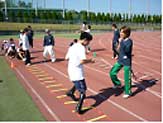 (陸上教室の開催風景〜車いすから立位まで、様々なキッズが、楽しく頑張っています!)